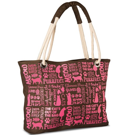 Cat lover’s shoulder bag. This 100% cotton canvas shoulder bag features witty cat phrases in a beautiful pink color on a rich brown cotton canvas. It has two rope handles, a zipper closure, and two inside pockets. It is perfect for toting items for your on the go essentials! Dimensions: 18″ W x 11 3/4″ H x 4 1/2″ D